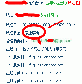 我最近在万网注册个域名,但是不知道为什么是显示停止解析,域名资料状态 显示成功~~