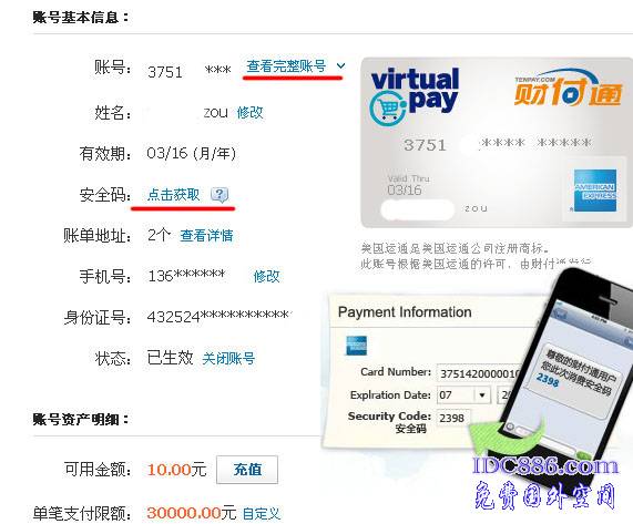 需要注意的是:这个虚拟运通卡的安全码和普通卡不一样,是利用短信接受的,每10分钟改变一次。另外你可以开通绿色通道,具体我也不介绍了,自己去尝试吧!