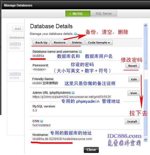 服务器地址:idc886a.db.5239609.hostedresource.com   专用的地址,每个数据库的都不同。