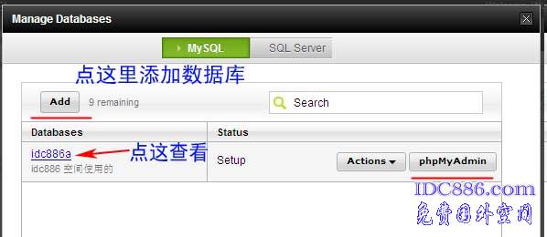 注:因为GD的免费空间,只能开10个数据库。已建1个,上面还显示9个可建。