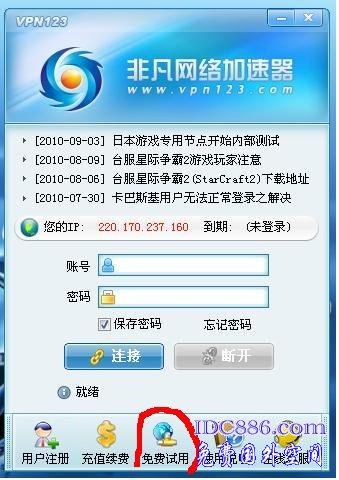 说明:我们现在提供的免费账号会每10分钟账号到期、自动断开VPN。到期后,系统会自动对免费账号增加试用时间[10分钟],会出现几秒钟或者几分钟的网络延时情况。如果出现这样的情况,请大家等待一会,再重新打开加速器,看到“使用到期时间”增加后就可以试用了。