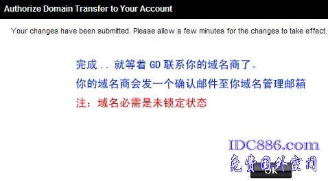 idc866.com  域名转入Godaddy 成功..看来效率真高..