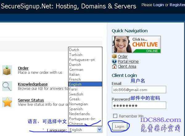 填写登录信息,用户名和密码都在发给你的邮件里。语言可选择中文