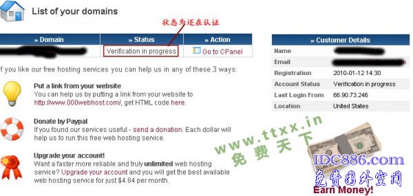3: 注册完成, 000webhost他们要人工认证, 你可以看到你的状态为“verfication in process”. 这时候你也做不了什么了,一定要催一下他们客服才行,如果现在不催客服,你有可能一直处于“Verification in progress”. 请看下一步。
