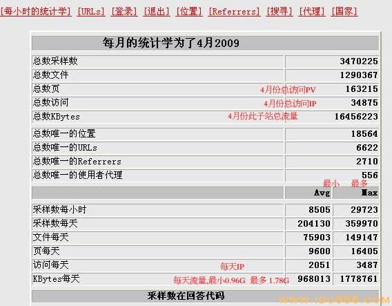 子站统计表,每月统计,IP,流量等。 (访问量与 51啦访问量统计有出入,相差一半)