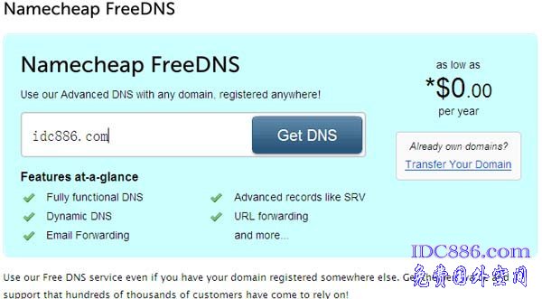 Namecheap是一家美国著名老牌域名空间服务商,创建于2000年,Alexa世界排名在一千左右,国内在其网站上购买域名的人不在少数。 Namecheap同时提供安全可靠的免费DNS服务,无论域名是否在Namecheap注册都可以使用,完全免费。只需免费注册一个用户即可使用。Namecheap Free DNS 服务有简单易用的管理介面、24/7免费支持、动态DNS,提供5台DNS服务器,支持设置A、CNAME、MX、TXT、 NS、AAAA记录(IPV6)、SRV 等解析记录,它同时支持邮箱转发,支持设置动态域名解析,另外它还支持国内管得非常严的网址转发服务(可选是否隐藏原域名,支持301重定向),所有记录的设置条数没有限制。